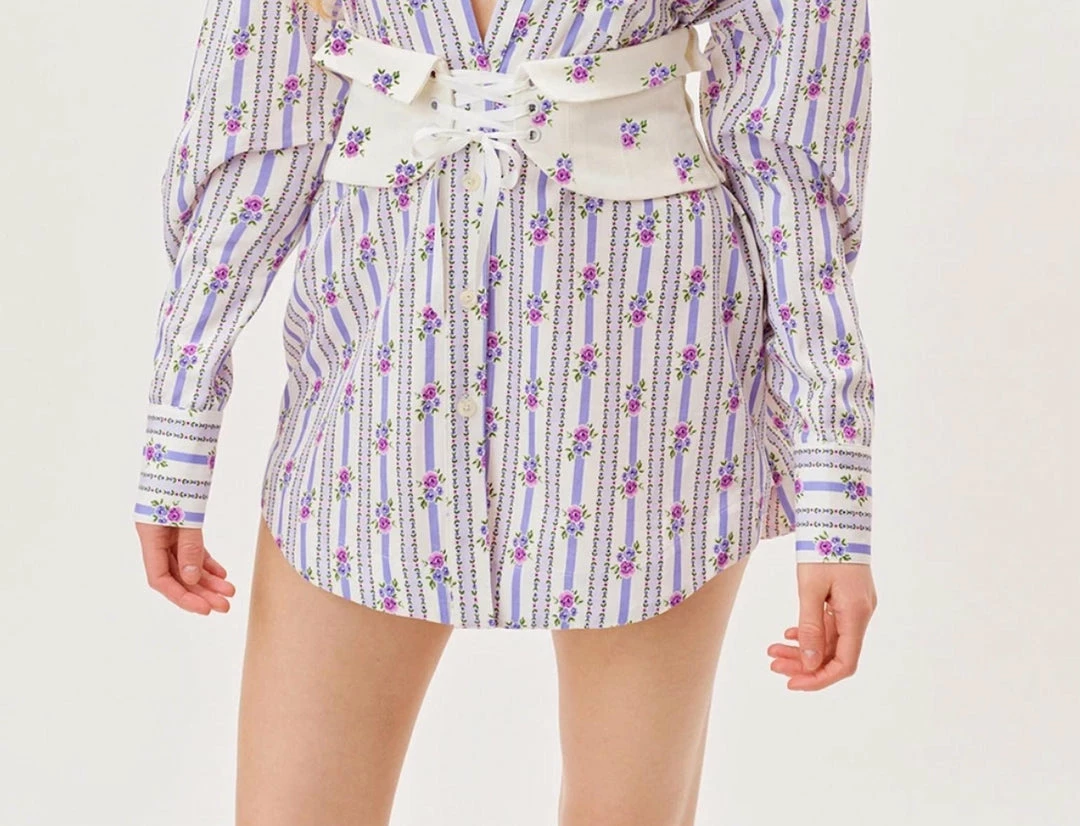 With an oversized fit, it can be worn as a shirt dress and has a classic collared neck and front button placket. It comes with a contrasting lace-up waist corset that can be removed. Fabrication – 100% LyocellCare – Dry cleanStandard Clothing Sizing