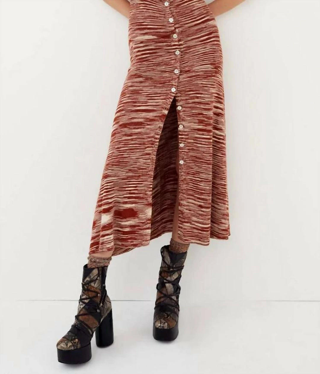 Space dye stripe knit midi dress with twisted neckline, cut-out details, and functional button placket along front.